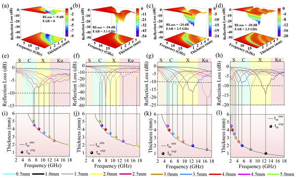 图1.(a-d)不同ZrO2、ZrB2负载量的四组样品在厚度分别为1 mm至5 mm的三维反射损耗图;(e-h)不同ZrO2、ZrB2负载量的四组样品在特定毡体厚度下的反射损耗图;(i-l)四组样品的模拟厚度和峰值频率之间的相关性。