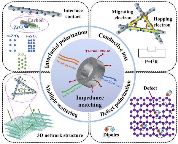 图2. ZrO2/ZrB2/C纳米纤维毡的电磁波吸收机理图。