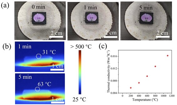 图3.(a)花瓣在厚度为8 mm的ZrO2/ZrB2/C纤维毡上被酒精灯加热前后的光学图片;(b)纤维毡在超过500 ℃的稳定热板上的红外热图像;(c)纤维毡的热导率与温度的函数。