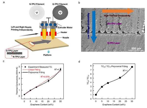 图1. FDM 3D打印的G-TPU/N-TPU双层结构及其各向异性导热比。