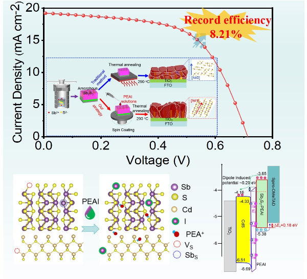 Sb2S3是一种极具潜力的太阳电池光吸收材料,然而溶液法制备的Sb2S3薄膜富含多种缺陷态,会影响载流子的传输并导致界面能级失配等问题,进而使得其太阳电池光电转换效率大都不高(6-7%)。鉴于此,研究团队提出一种基于非晶态Sb2S3薄膜中可降解苯乙基碘化铵(PEAI)渗透作用的全维度缺陷钝化策略,实现了晶态Sb2S3薄膜中的[hk1]取向结晶、全维度缺陷钝化(体相与界面)及双界面(电子和空穴抽取界面)能级重构,最终获得了效率高达8.21%的Sb2S3体异质结太阳电池,是此类电池目前报道的最高转换效率纪录。该研究为新型Sb2S3高效太阳电池的设计和制备提供了新思路。