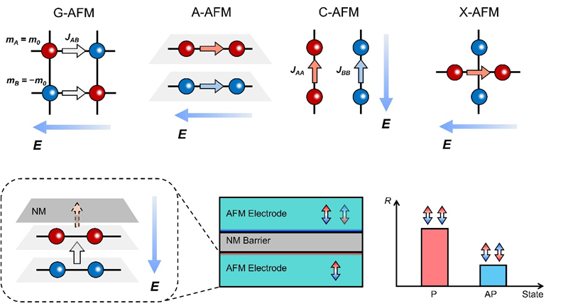 随着信息技术持续向更小尺寸、更高集成度和更低功耗方向发展,传统半导体器件逐渐逼近物理极限。自旋电子学通过同时调控电子的电荷与自旋自由度,被认为是突破现有技术瓶颈的关键方向。其中,反铁磁材料凭借无净磁矩、无杂散磁场、以及超快磁动力学响应等独特优势,有望满足下一代器件对小型化、高密度集成、低能耗运行、高速读写及高稳定性的多重需求,成为构建高性能自旋电子器件的理想候选体系。而基于量子隧穿效应的反铁磁隧道结(AFMTJ)是实现其应用的核心器件。然而,传统反铁磁材料本身缺乏宏观自旋极化,如何在其中实现可用于信息读取的显著隧道磁阻效应,一直是该领域亟待攻克的关键难题。