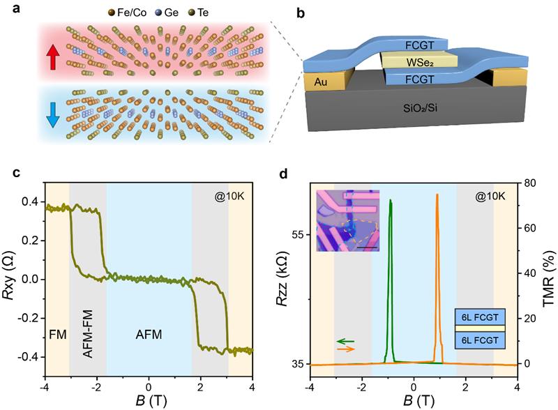 近日,中国科学院合肥物质科学研究院固体物理研究所邵定夫研究员课题组在反铁磁自旋电子学领域取得重要突破,提出了一种由反铁磁金属界面效应诱导强自旋极化新机制,并基于此理论设计出高性能共线性反铁磁隧道结(Yang et al., Newton 1, 100142 (2025))。随后,团队与合肥工业大学王澜教授课题组合作,成功在实验上实现了该理论构想,在(Fe0.6Co0.4)5GeTe2/WSe2/(Fe0.6Co0.4)5GeTe2全反铁磁隧道结中观测到高达 75% 的隧道磁阻(TMR)效应。相关成果以“Interface-controlled antiferromagnetic tunnel junctions based on a metallic van der Waals A-type antiferromagnet”为题,发表于国际权威期刊 Nature Communications(Nat. Commun., 2025, DOI:https://doi.org/10.1038/s41467-025-66981-5)。