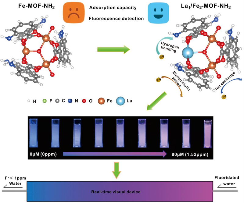 氟离子作为常见水体污染物,适量存在有益人体健康,但超出安全阈值 (大于1 mg/L) 后会诱发氟斑牙、氟骨症等疾病,严重威胁人体健康与生态系统安全,而当前除氟技术普遍存在效率低以及去除与检测分离等问题,难以满足实际治理需求。MOFs凭借其比表面积大、孔隙率高、孔径可调,以及独特光学性能等优势,成为了水中氟污染物检测与去除的理想候选材料。